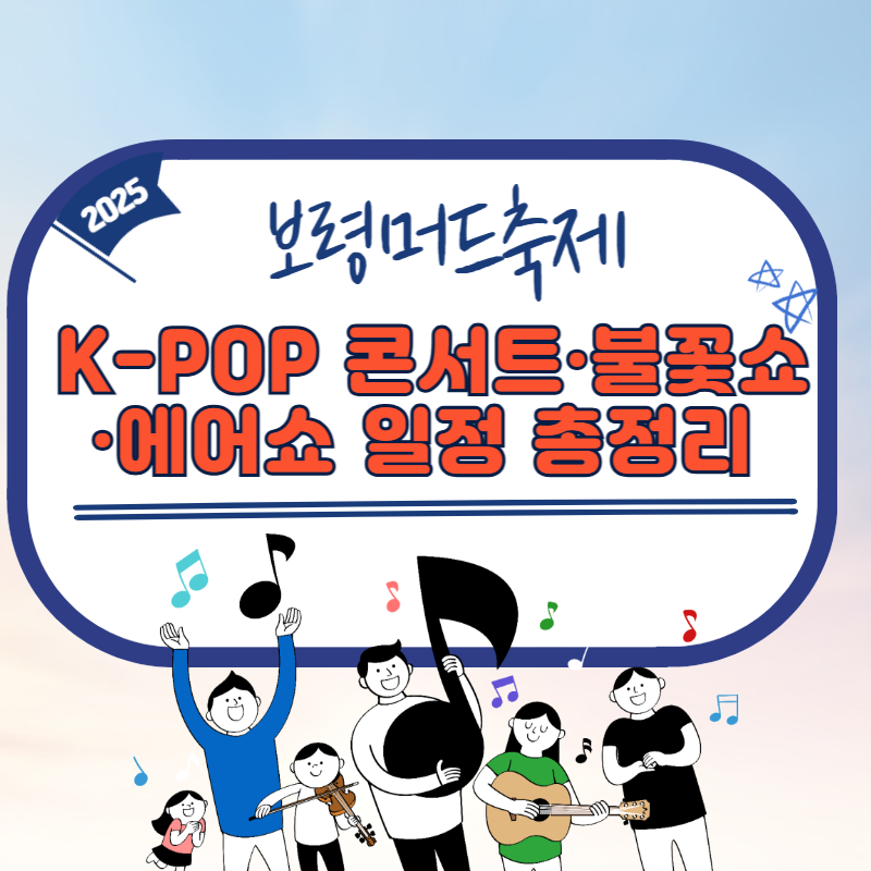 7월 25일부터 8월 10일까지 대천해수욕장에서 진행되며, 무료 K-POP 슈퍼콘서트, 환상적인 불꽃놀이, 드론라이트쇼, 대한민국 공군의 에어쇼까지 다양한 프로그램이 기다리고 있습니다.