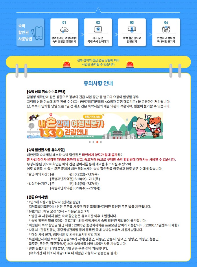 | 특별재난지역편 | 6/18(수)~7/17(목) | 7만원 이상 예약 | 5만원 할인 |