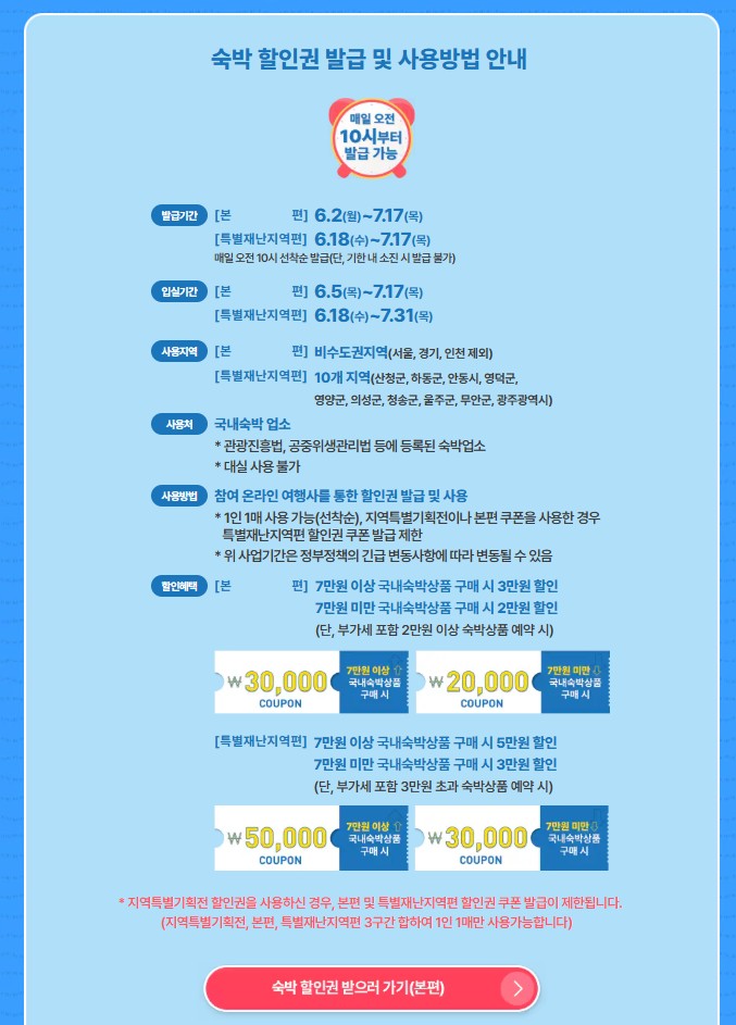 모든 할인권은 매일 오전 10시 선착순 발급되며, 발급 당일 오전 10시부터 익일 오전 7시까지 사용 가능합니다. 지역특별기획편은 당일 오전 10시~익일 오전 7시에만 사용 가능하며, 본편과 특별재난지역편도 동일한 시간 제한이 적용됩니다.